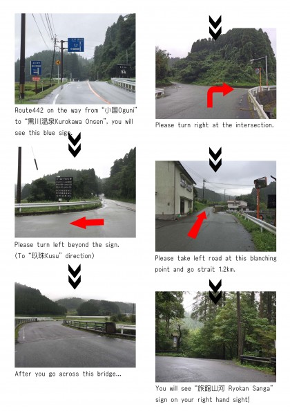2016年4月24日 迂回路 Diversion お知らせ 黒川温泉街から山河へ向かう道に土砂崩れの危険箇所があり全面通行止めになっています。 442号線、田の原温泉からお越しくださいませ。 The road from Kurokawa Onsen village is now closed. Please drive from Tanoharu Onsen on the route 442 as this photos.